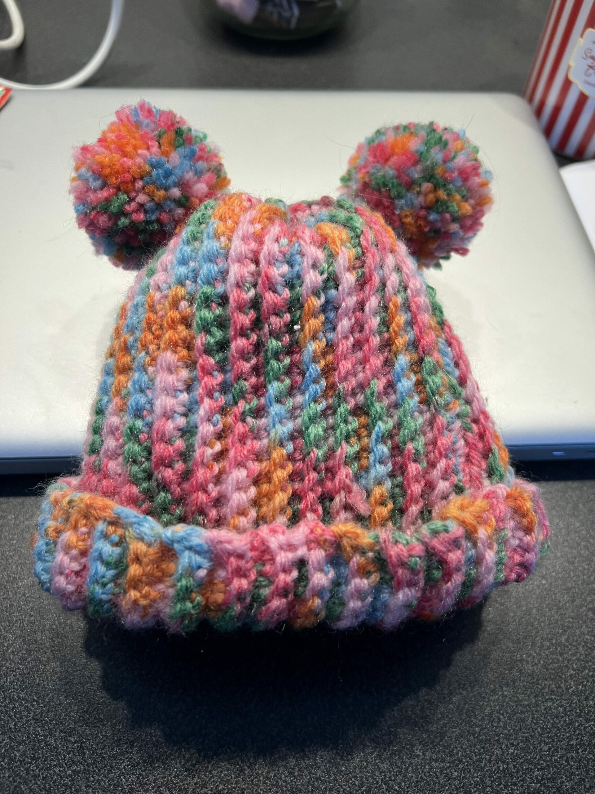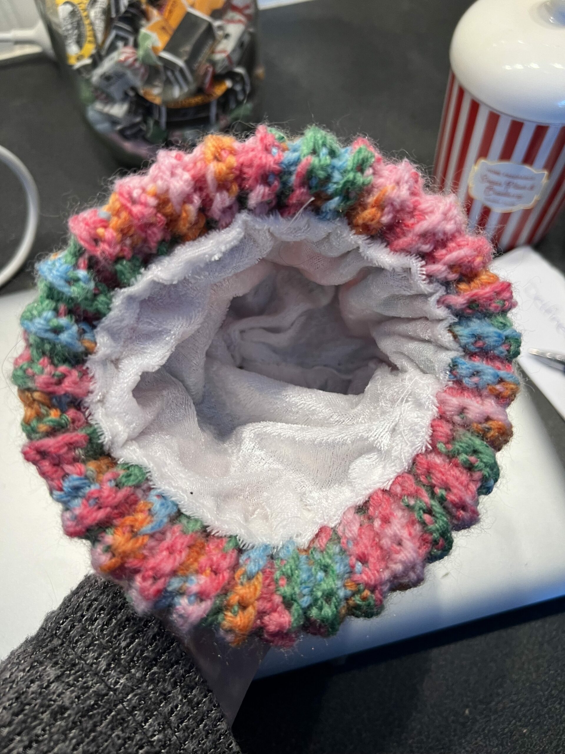 Jag hoppas att den passar, för givetvis har jag bara gjort på fri hand, och den kan vara både för liten och för stor, eller så är den perfekt. Lite funderar jag på om jag ska virka två små öronlappar, eller kanske sätta i knytband räcker, men det glömde jag tydligen igår:)