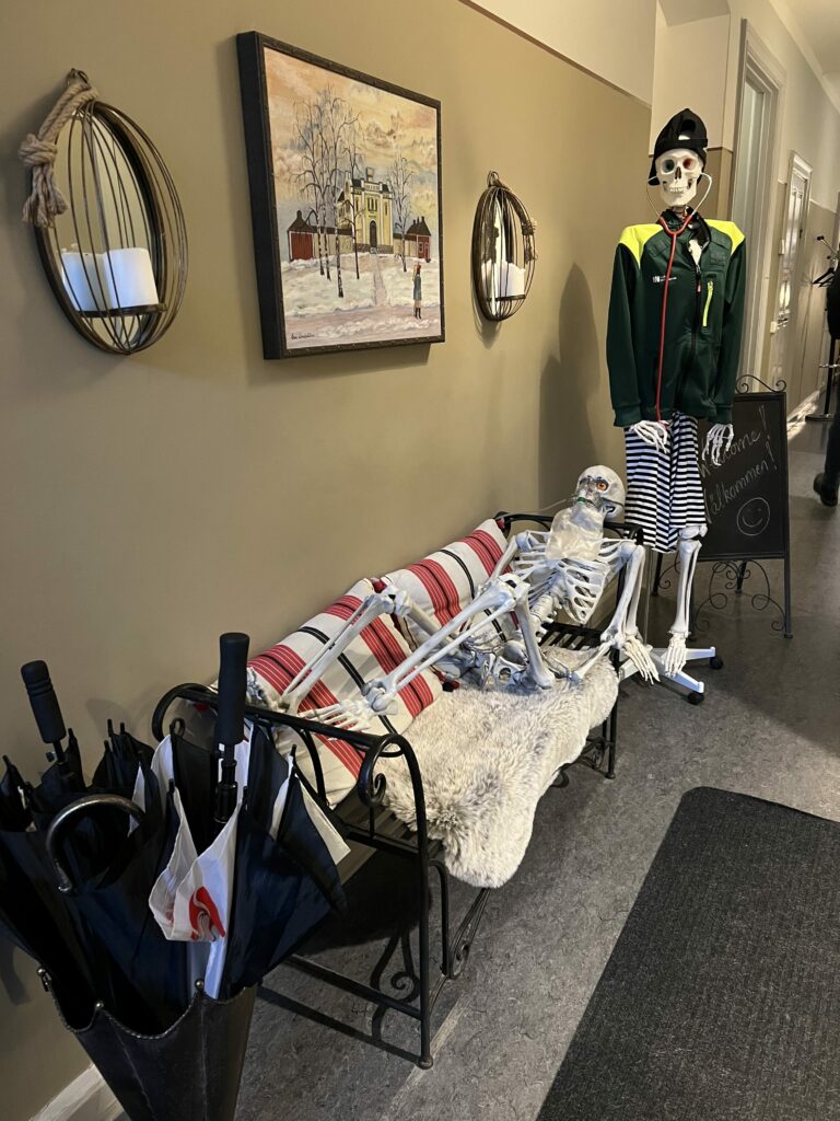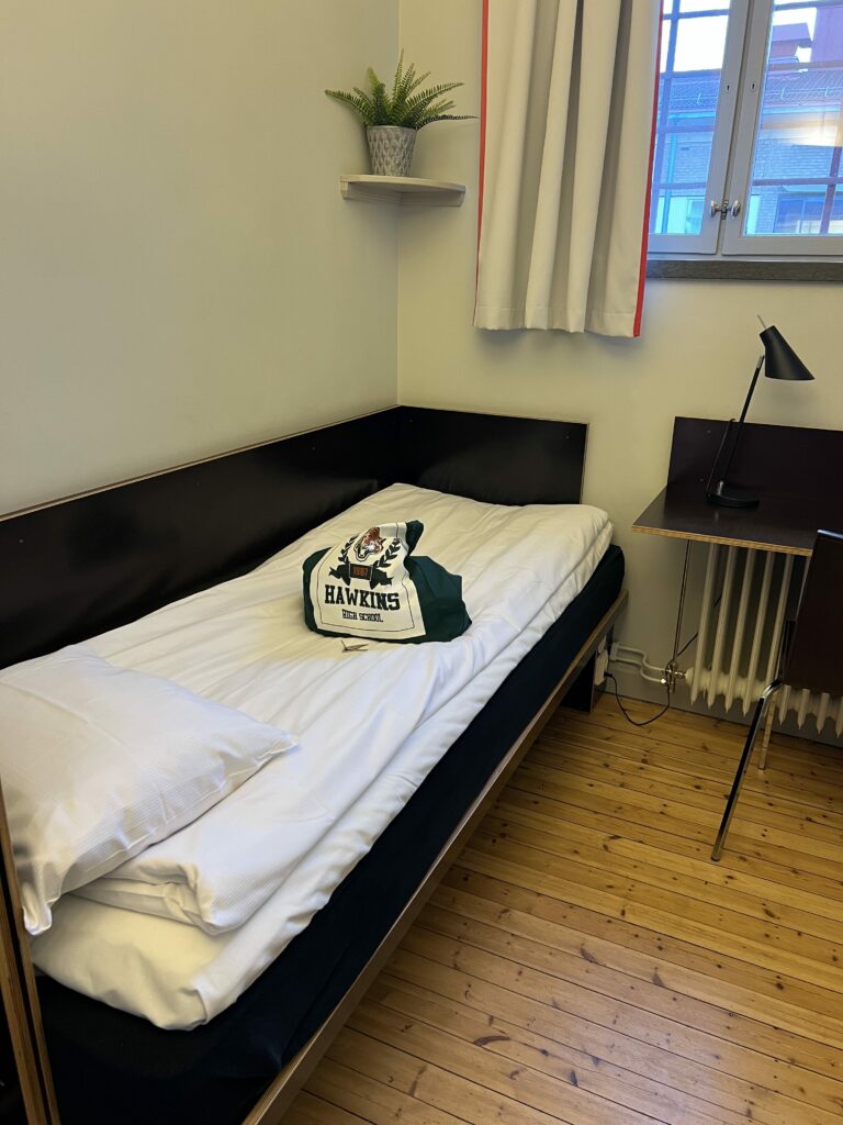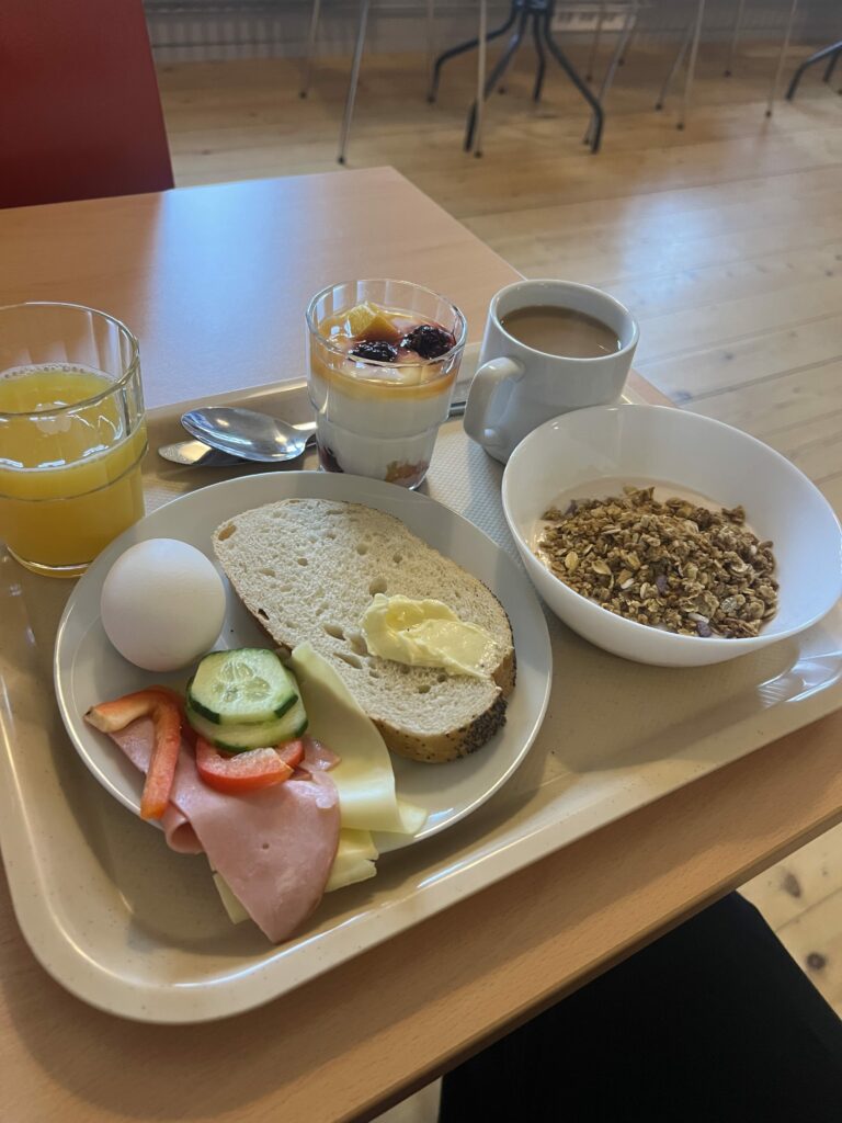 Jag vaknade efter att ha sovit så gott! Som en stock och jag var utvilad. Det händer i princip aldrig det heller, jag är alltid svintrött när jag vaknar, har alltid varit. Frukosten var mellan … öh, typ halv sex och halv nio, och jag hade klockan på sju. Vi skulle samlas halv tio utanför Littfest så det var noll stress. Jag klev upp och gick och fixade mig. Det är dusch och toalett i korridoren här, något jag för några år sen aldrig valt, men nu för tiden känns det nästan som jag dras till det. Inte så att jag skulle tycka illa vara om det fanns på rummet, men det är något med det simpla i det som tilltalar mig:) De gemensamma utrymmena var väldigt välskötta, det var rent och doftade gott, och det låg handdukar och badrockar så man lätt kunde förse sig. Sen gick jag till frukosten. Jag hade inte väntat mig en så fin frulle faktist men oj så jag fick ändra uppfattning.