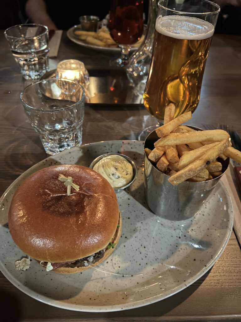 Jag funderade på att skita i att äta, men det kändes fånigt så till sist tog jag en burgare, 150g, skitstor, och svindyr:) Eller den kostade 225spänn, det är väl rätt normalt men i min värld är det totalt o-värt.