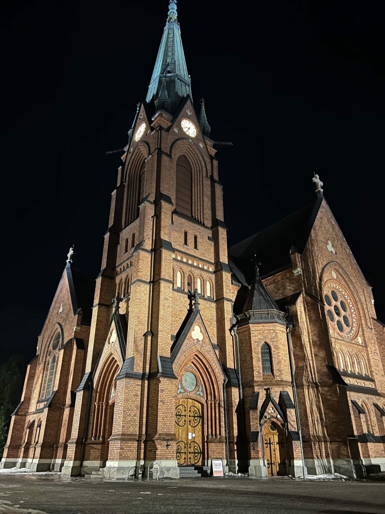 Vi satt här och babblade på, men alla var rätt sega och trötta så vi gick hemåt redan vid nio. Jag var glad att mitt hotell låg en bit bort för då kunde jag promenera bort lite mättnad. Det var skönt att promenera, vädret var trevligt och jag kunde också passa på att kika lite närmare på den oerhört vackra kyrkan.