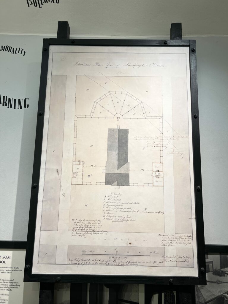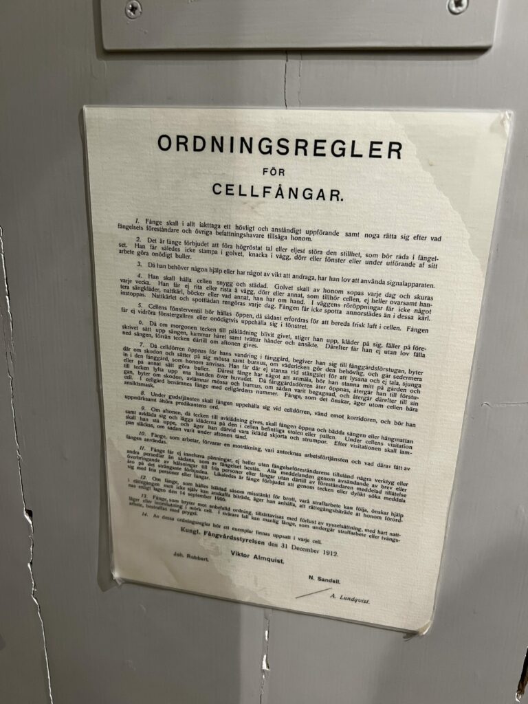 Jag lärde mig i fängelsemuseeumet att då, 1861 var tanken att fångarna skulle hållas isolerade i sin cell 24/7, och möjligen gå ut en stund i en rastgård, men då försågs de med huva/mask under själva promenaden till och från. De skulle inte socialisera sig med de andra fångarna och inte kunna känna igen varandra efter avtjänat straff. Det för att undvika gängbildning, och det är ju en klok tanke. Cellerna var inte stora direkt, där jag står är dörren och en klädstång. Det är högt i tak så det känns inte klaustrofobiskt, och fönstren är stora. Men ursprungligen var de mindre.