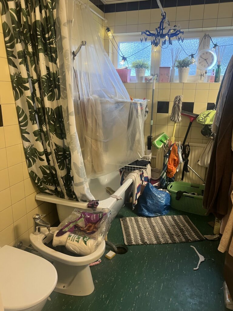 Det ser ofta ut som skit. Det är helt ickeoptimerat i förvaring eller ens möblering av de fasta installationerna, och värre blev det efter att vi installerade ventilation som går ner genom ett av de två skåp vi hade, och alltså minskade förvaringen ännu mer. Jag har en tvättmaskin här, men ingen tumlare, och jag och Jamie duschar oftast uppe. Jag för att jag har alla mina saker här, Jamie för att han är rädd för spindlar i tvättstugan där duschen finns:) Bidén är ju inget man använder, förr tvättade vi fötterna i den men nu är tvättmaskinens vatten kopplat därifrån så det för mest en skräphög. Jimpa har satt upp hyllor till höger som inte syns, vilket är en guldgruva, där har vi alla schampon, hårfönar osv.