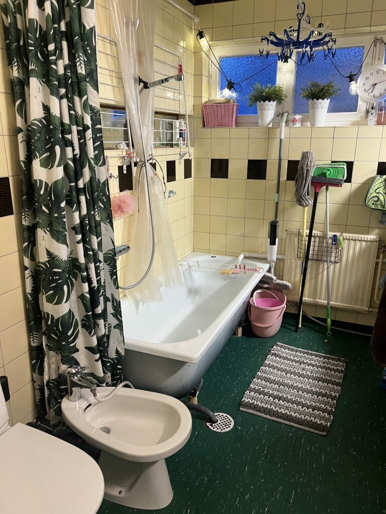 Badrummet är ju sen evigheters evighet, men vet ni? Jag älskar kaklet! Det är vaniljgult och så fint. Det gröna golvet är också fint även fast det är en vanlig gammal plastmatta, men jag tycker om det.