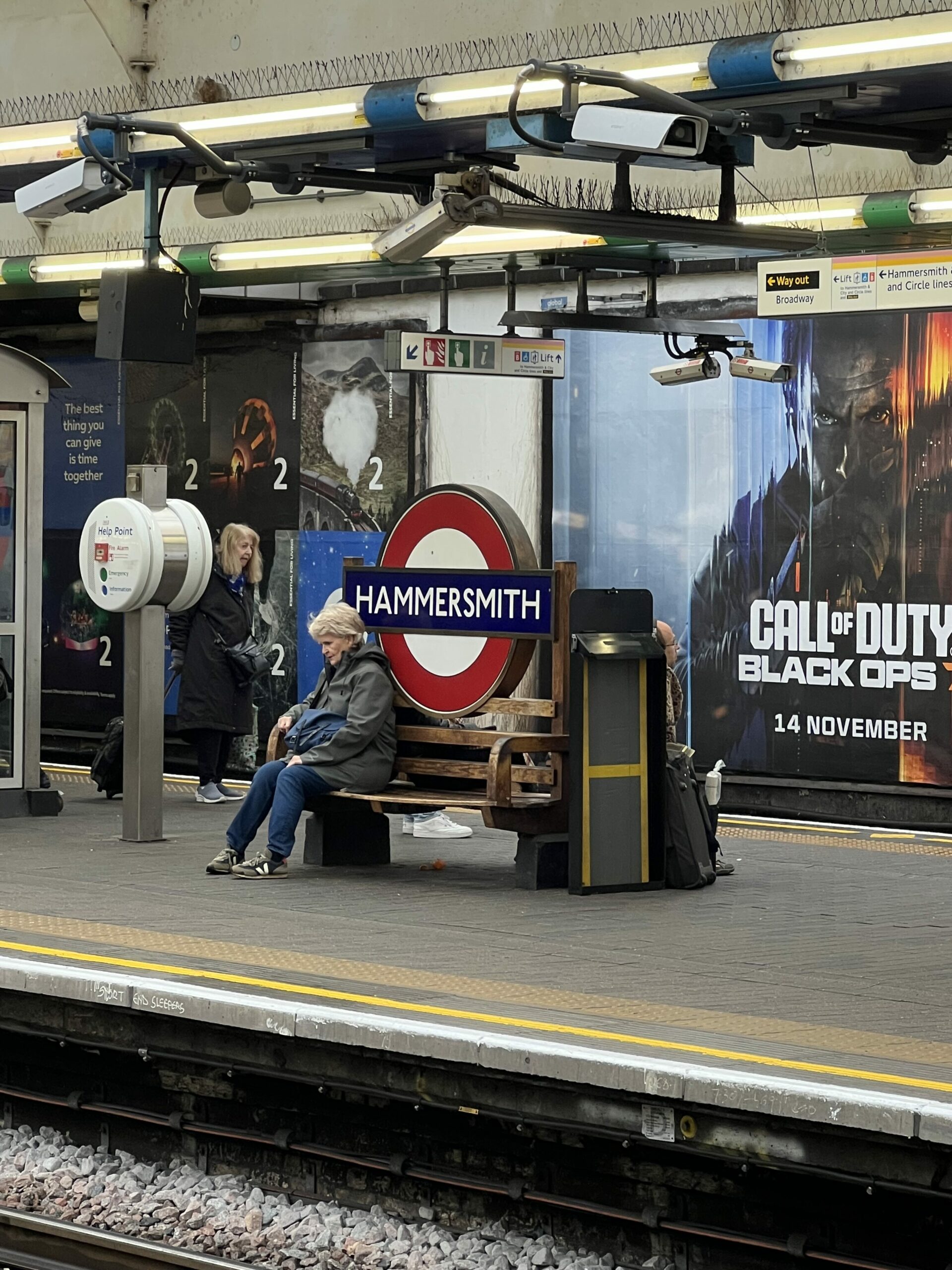 Vi bad att få ställa in våra väskor i bagagerummet, gjorde det och sen gick vi en sista gång ner på stan, i Hammersmith. Det regnade, började kvällen innan och stora tunga droppar föll i skallen på en, så paraplyerna kom väl till pass. Det upphörde sen, tacksamt nog.