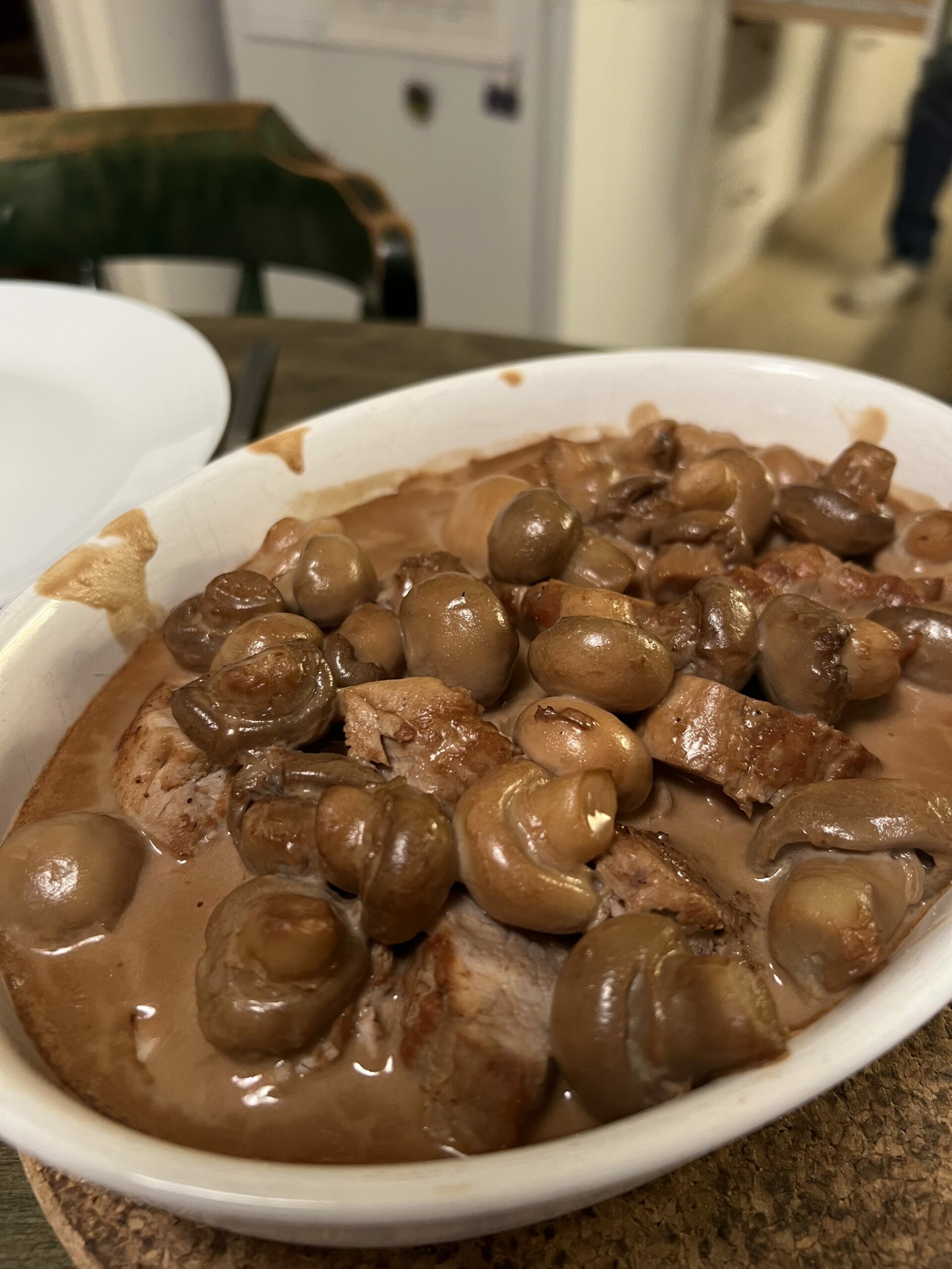 Hos mamma så bjuder hon alltid på mat, och det är alltid vi som beställer, samma sak:) En fläskfilé i ugn med champinjoner som hon hävdar att hon aldrig gjort, men som vi minns från ungdomen.