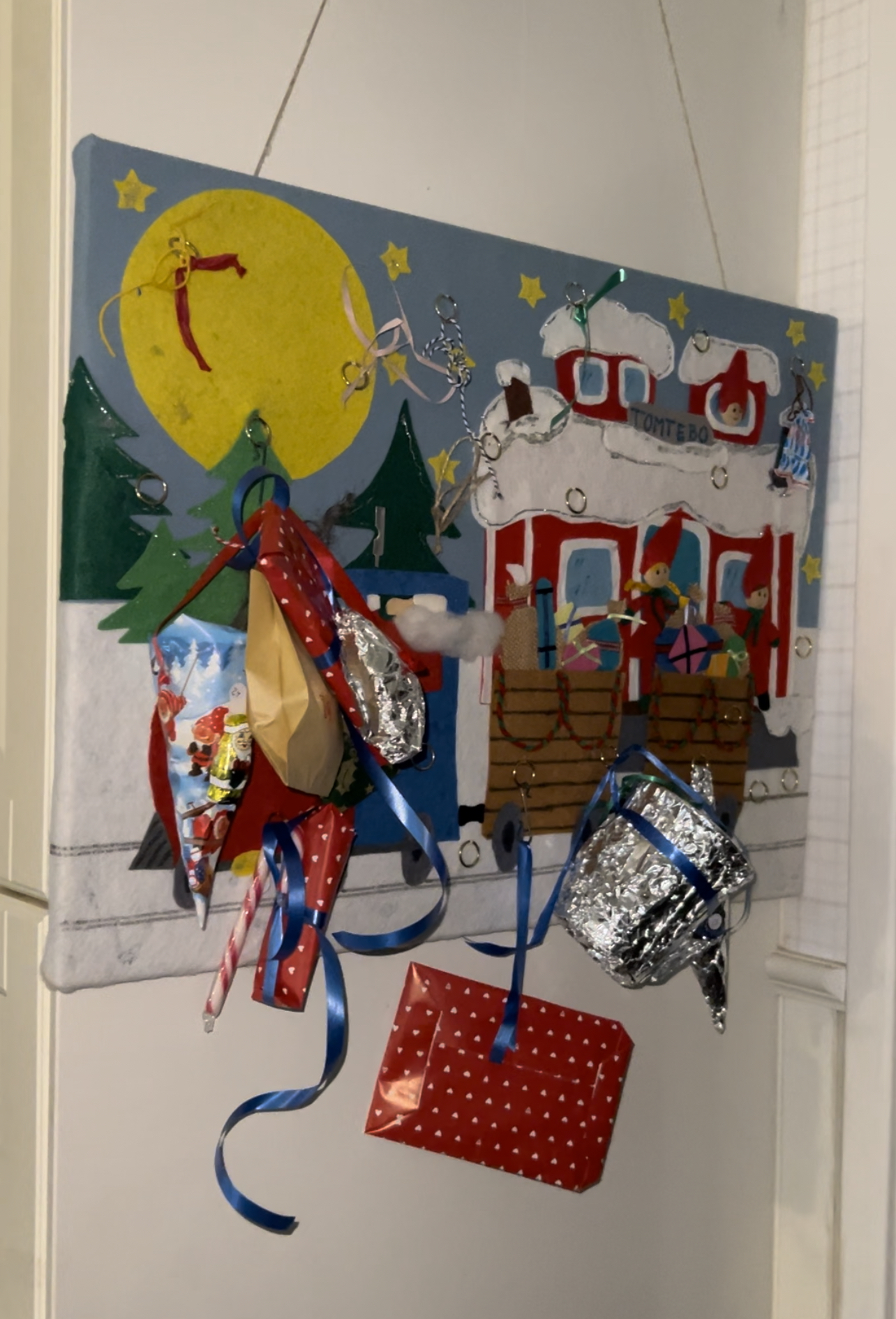 Vi har nio kalendrar att göra. Mamma har ju gjort alla kalendrarna och sen ska de fyllas på varje år. Vi kör billigt och mycket godis, nivån är låg, och det är där jag tycker att man ska lägga sig om man vill göra en kalender. Om man börjar med att det i varje paket ska vara något ”bra” så är man snart uppe i hundratals kronor per kalender, och barnet förväntar sig samma sak, om inte bättre, nästa år, och vips är förväntningarna sky high och priset likaså. Vi letar småsaker, som ändå går åt, som ansiktsmasker, eller tandborstar, eller hårsnoddar, och sen blir det chokladbitar, tuggummin, kolor osv. Den som anser att det är förkastligt med godis varje dag kan ta och sätta sig på händerna, för det handlar om ytterst lite och under en väldigt begränsad tid på året.