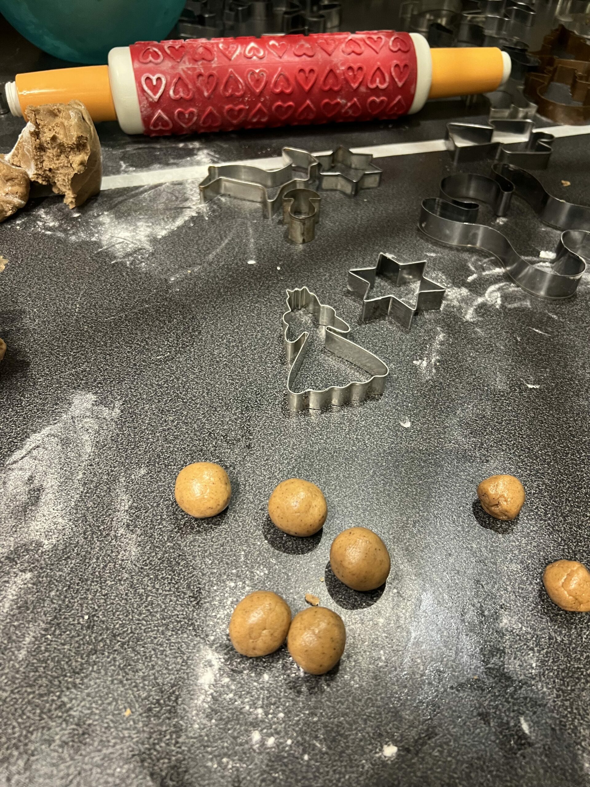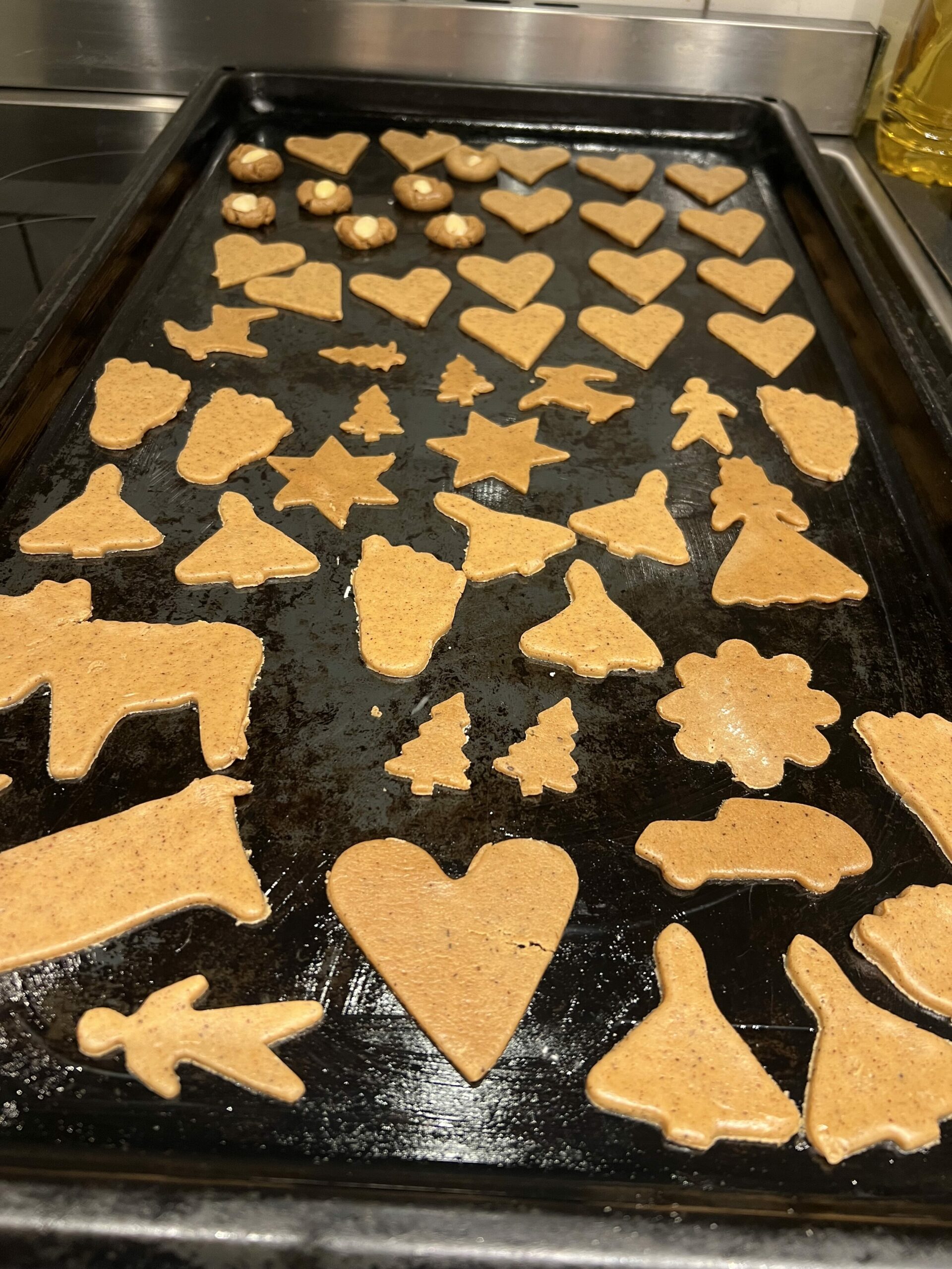 Patricia och Abdel ville komma och baka pepparkakor så det gjorde de, och inför det så röjde jag köksön, städade köket och sånt där. Jag satte ju en deg för några dagar sen och den var väldigt trevlig nu. Fin konsistens och smakade som den skulle. De hade med sig färdigköpt deg också, och vi grejade på i några timmar.