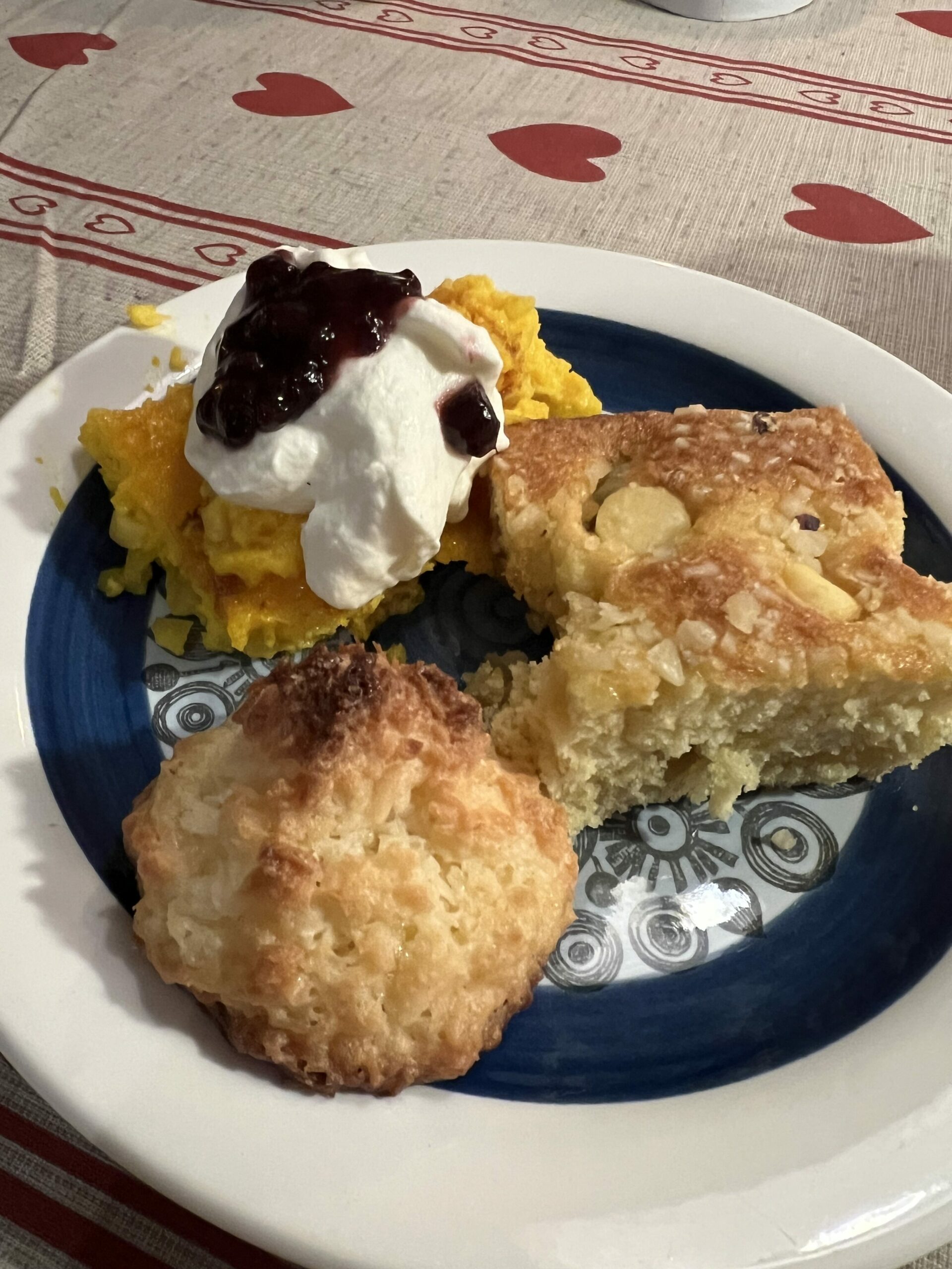 Ja, vad gör man? Vi skulle ha kalas så det var bara att kliva upp, käka frukost och förbereda. Jag hade bakat dagen innan, saffransrutor, och det fick räcka. Vi brukar ju baka allihopa och det blir alltid en gigantisk buffé 🙂 Nu var Janelles familj lite skruttiga så de kunde Inter komma, men syrran hade bakat både kokostoppar och saffranspannkaka. Sjukt gott!