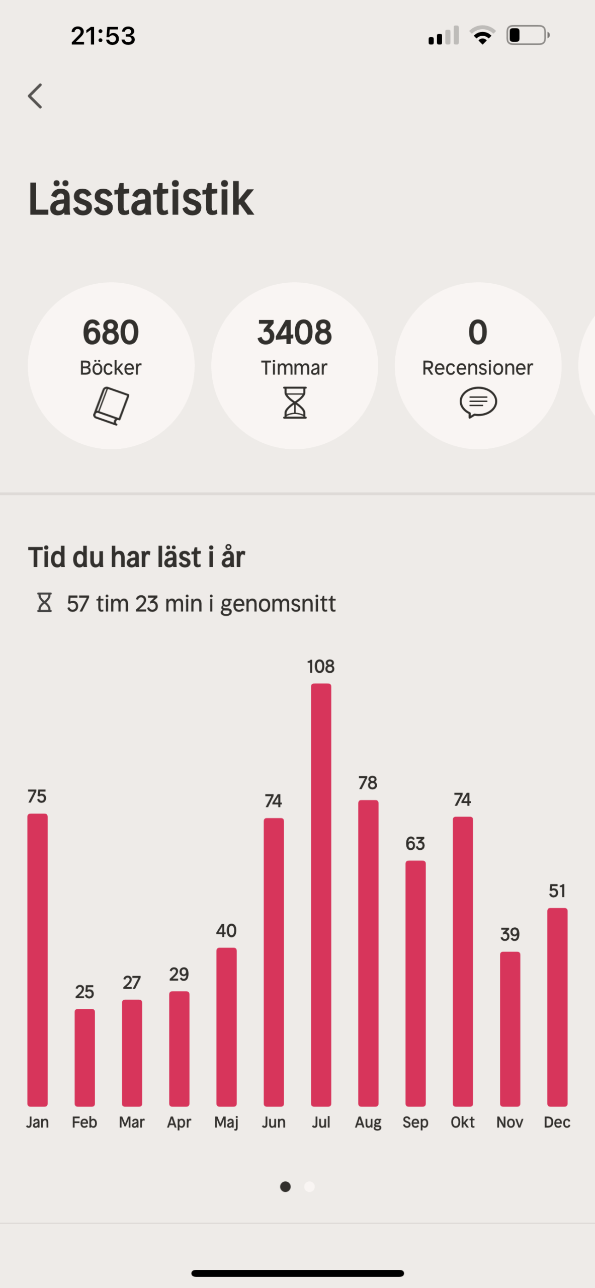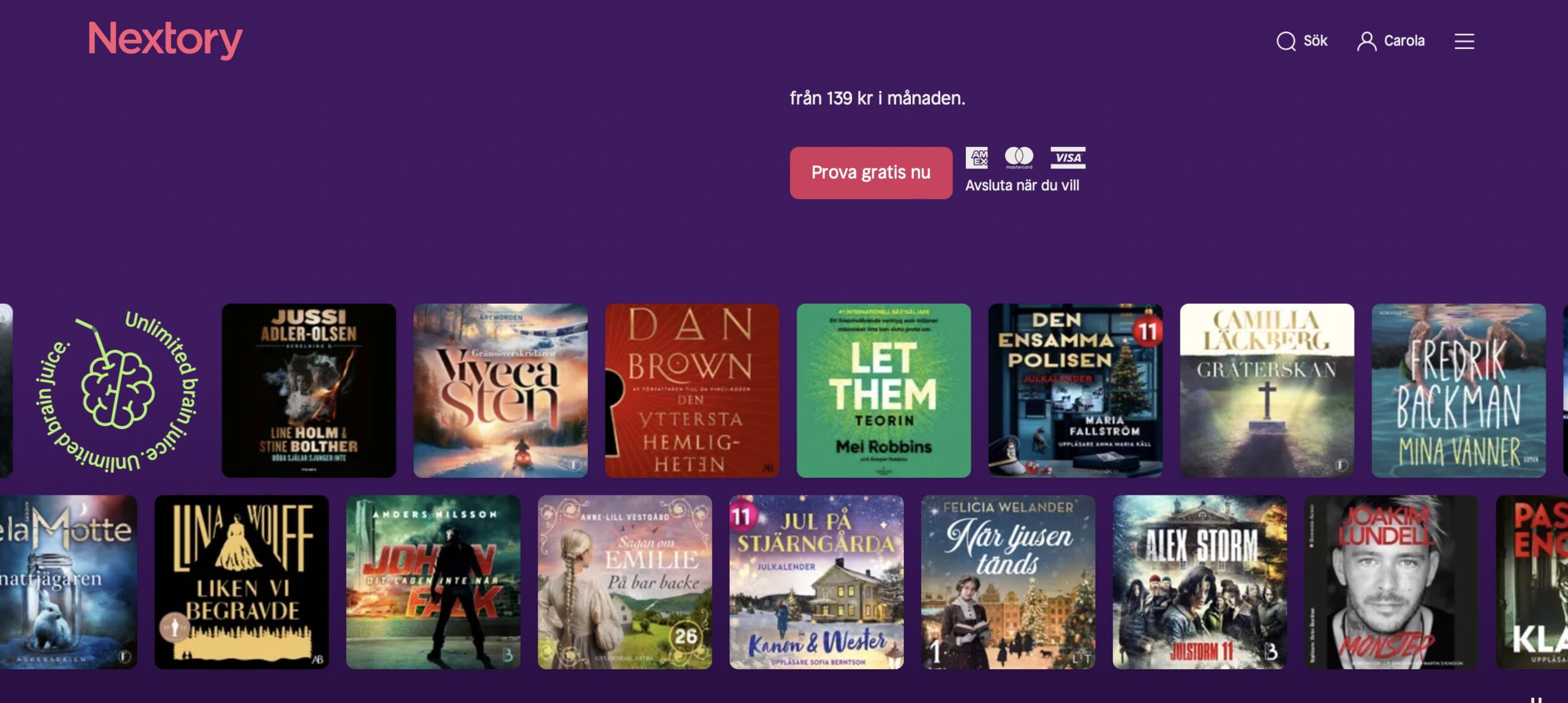 Jag har ett abonnemang som jag tror heter Unlimited 2, då får jag lyssna hur många timmar som helst per månad, och vi kan vara två användare samtidigt. Kidsen brukar dela på en profil, de läser oftast bäcker de behöver läsa i skolan, men ibland också vanliga skönlitterära för att det är kul. Om det är något jag känner att jag borde gjort mer, som jag faktiskt ser som ett misslyckande som förälder, så är det att jag läst väldigt lite för ungarna.